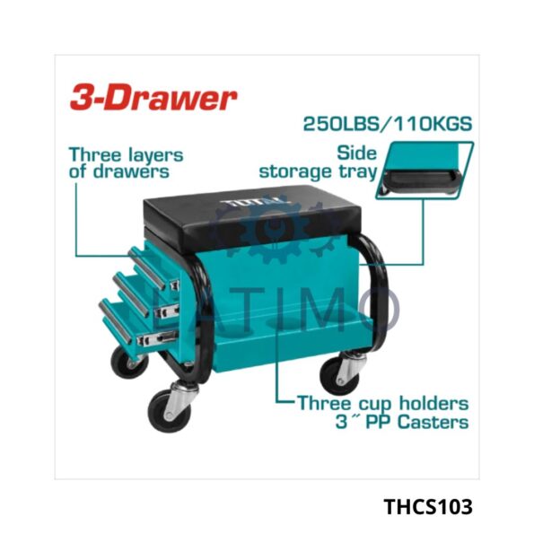 Type : Siège d’atelier (tool creeper seat) Rangements : 3 tiroirs latéraux 1 plateau avant 1 support arrière Conditionnement : Carton