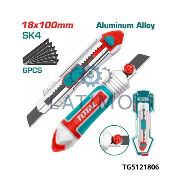 Taille de la lame : 18 mm × 100 mm Longueur totale : 185 mm Livré avec 6 lames SK5 (réf. THT519181) Avec boulon de verrouillage de lame Équipé d’un bouton poussoir plat Corps en aluminium Poids net : 190 g Emballage : sous double blister