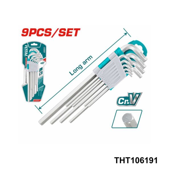 Taille : 1,5-10 mm Matériau : Cr-V Emballé sous double blister Traitement thermique et placage chromé Ensemble de 9 clés hexagonales (longues) : 1 pièce de 1,5 mm 1 pièce de 2,0 mm 1 pièce de 2,5 mm 1 pièce de 3,0 mm 1 pièce de 4,0 mm 1 pièce de 5,0 mm 1 pièce de 6,0 mm 1 pièce de 8,0 mm 1 pièce de 10,0 mm