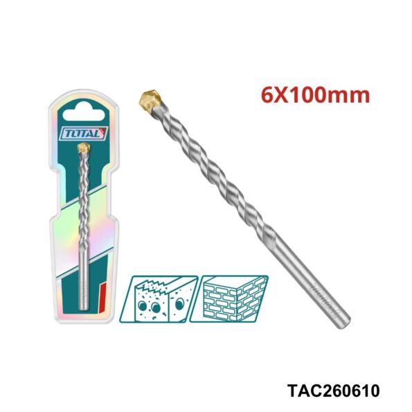 Diamètre : 6 mm Longueur : 100 mm Matériau de la pointe : Pointe en carbure de haute qualité pour une durabilité accrue Applications : Convient pour le perçage du béton, du ciment, de la brique et des parpaings