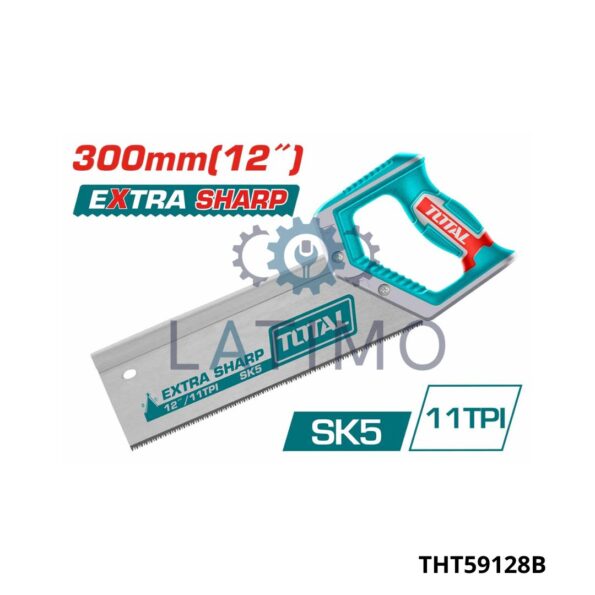 Matériau : acier SK5 Taille : 300 mm (12″) Épaisseur de la lame : 0,8 mm Denture : 11 TPI (dents par pouce) Poignée au design unique et ergonomique Protège-dents inclus pour plus de sécurité Lame traitée thermiquement pour une meilleure durabilité Emballage : montée sur carte en papier