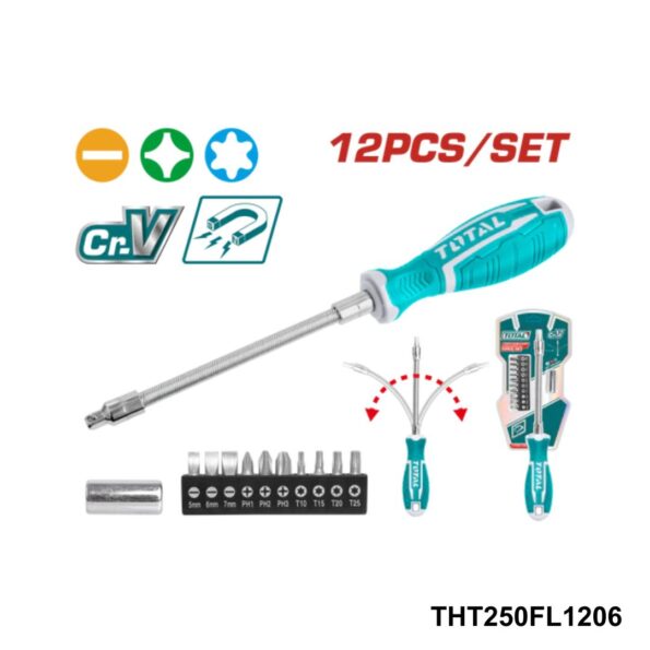 Coffret de 12 tournevis à manche flexible Inclus : 1 manche flexible 1 adaptateur pour embouts 4-6 mm (25 mm) 10 embouts de tournevis 6,35 x 25 mm : SL5, SL6, SL7, PH1, PH2, PH3, T10, T15, T20, T25