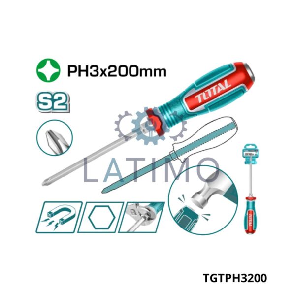 Tournevis traversant Phillips Matériau de la lame : S2 Type de pointe : Phillips PH3 (magnétique) Longueur de la lame : 200 mm Diamètre de la tige : 8 mm Type de tige : hexagonale Aimantation puissante Emballage : suspendu sur cintre en plastique