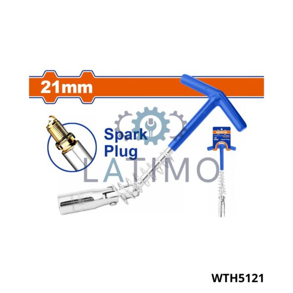 Clé pivotante en acier au carbone chromé avec poignée en T recouverte de plastique. Insert en caoutchouc pour la protection et la rétention de l’isolateur de bougie d’allumage. Caractéristiques : Numéro de modèle : WTH5121 Taille : 21mm