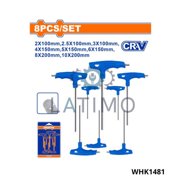 Jeu de 8 clés Allen à poignée en T Dimensions : 2 x 100, 2,5 x 100, 3 x 100, 4 x 150, 5 x 150, 6 x 150, 8 x 200, 10 x 200 Matériau : Cr-V, traitement thermique et chromage Emballage sous double blister