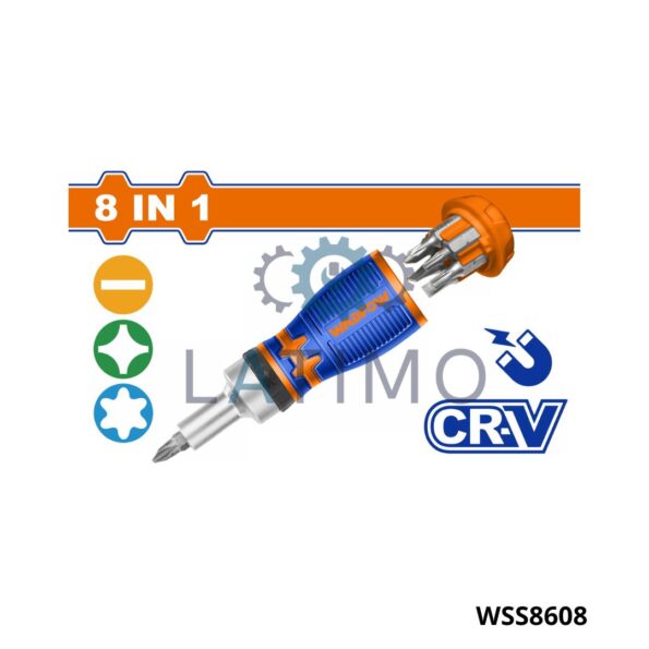 Coffret de tournevis à cliquet court 8 en 1 Matériau : Cr-V Contenu : 1 manche à cliquet 7 embouts de tournevis 1/4″ x 25 mm Taille : SL5, SL6, PH0, PH1, PH2, T10, T20