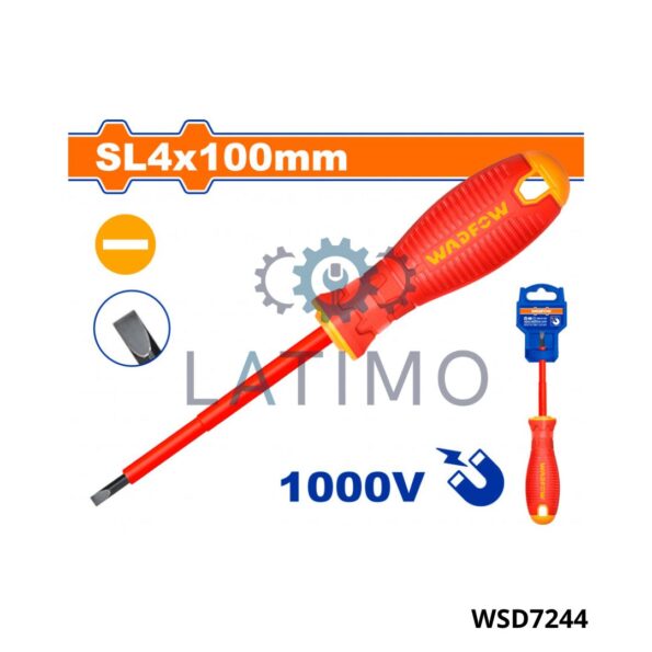 Matériau : acier Cr-V Finition de la lame : pointe noire Pointe aimantée Poignée confortable à prise souple Type de tournevis : isolé 1000 V WSD7244 TOURNEVIS ISOLER FR 4*100 : Type de pointe : à fente Taille de la pointe : SL4.0 Queue ronde Longueur : 100 mm