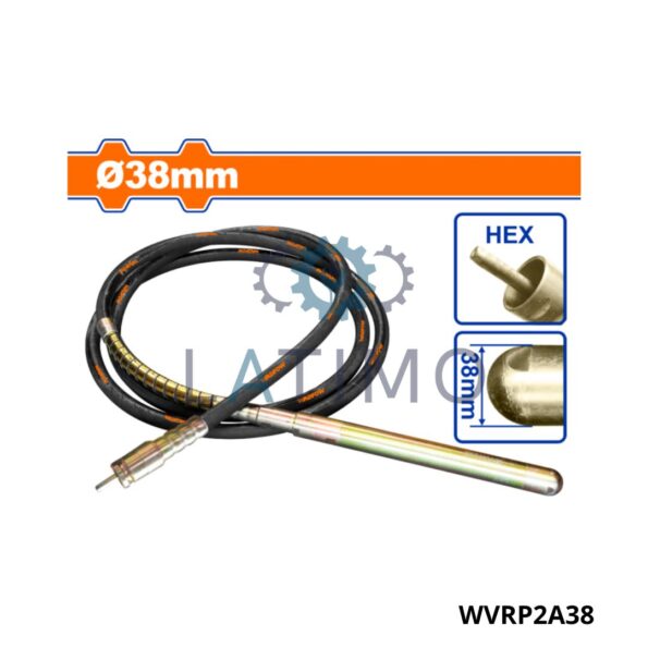 TUYAU POUR VIBRATEUR HEX 38MM -Diamètre : 38 mm -Longueur de la tête : 465 mm -Accouplement de type HEX -Fréquence des vibrations : 200 Hz -Amplitude des vibrations : 1,2 mm -Longueur du tuyau flexible : 6m
